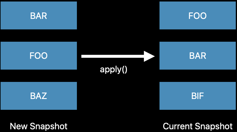 ํ์ฌ์ ๊ฐ๋ค์ ๊ฐ๊ณ ์๋ DiffableDataSource์ ์กด์ฌํ๋ ์ค๋ ์ท์์ ์๋ก์ด ์ค๋ ์ท์ ์ ์ฉ(apply)ํ๋ ๋ฐฉ์์ผ๋ก ์ ๋ฐ์ดํธ ํ๋ค.