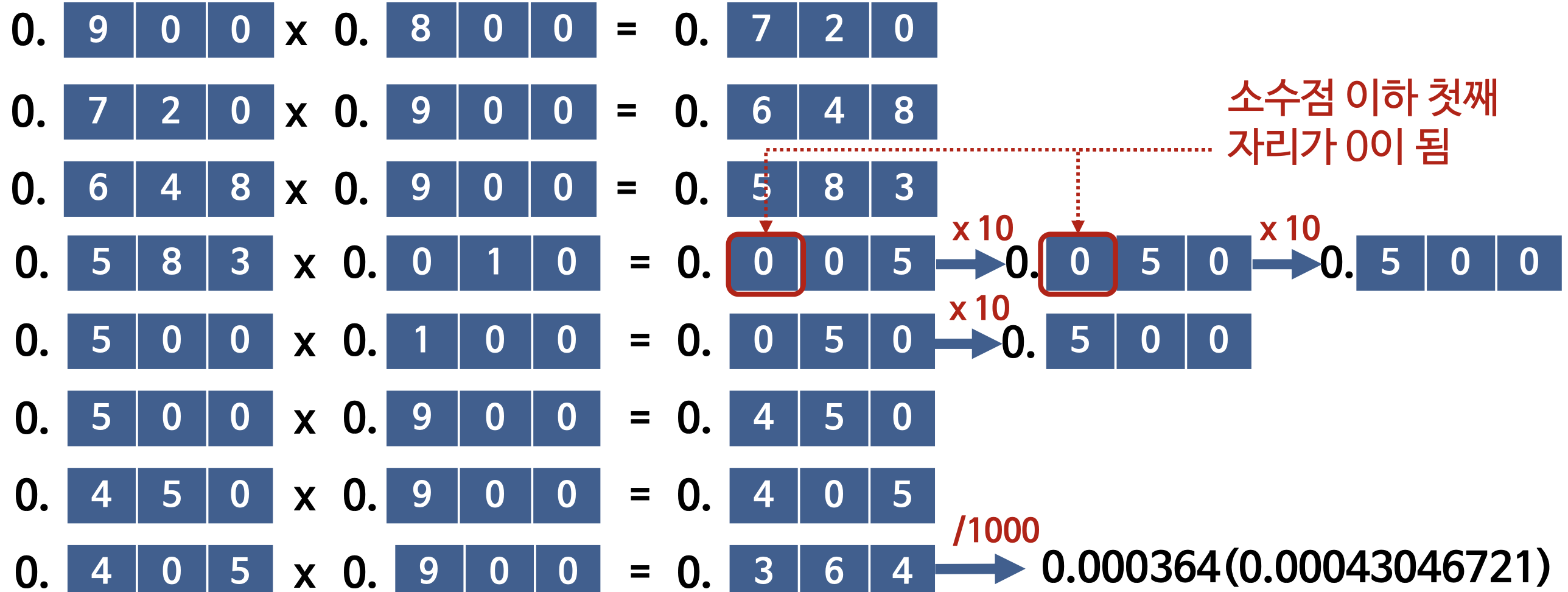 컴퓨터에서 소수점 자리를 한정해서 데이터를 저장하는 경우, 하위 소수점 자리가 사라지는 문제가 발생함