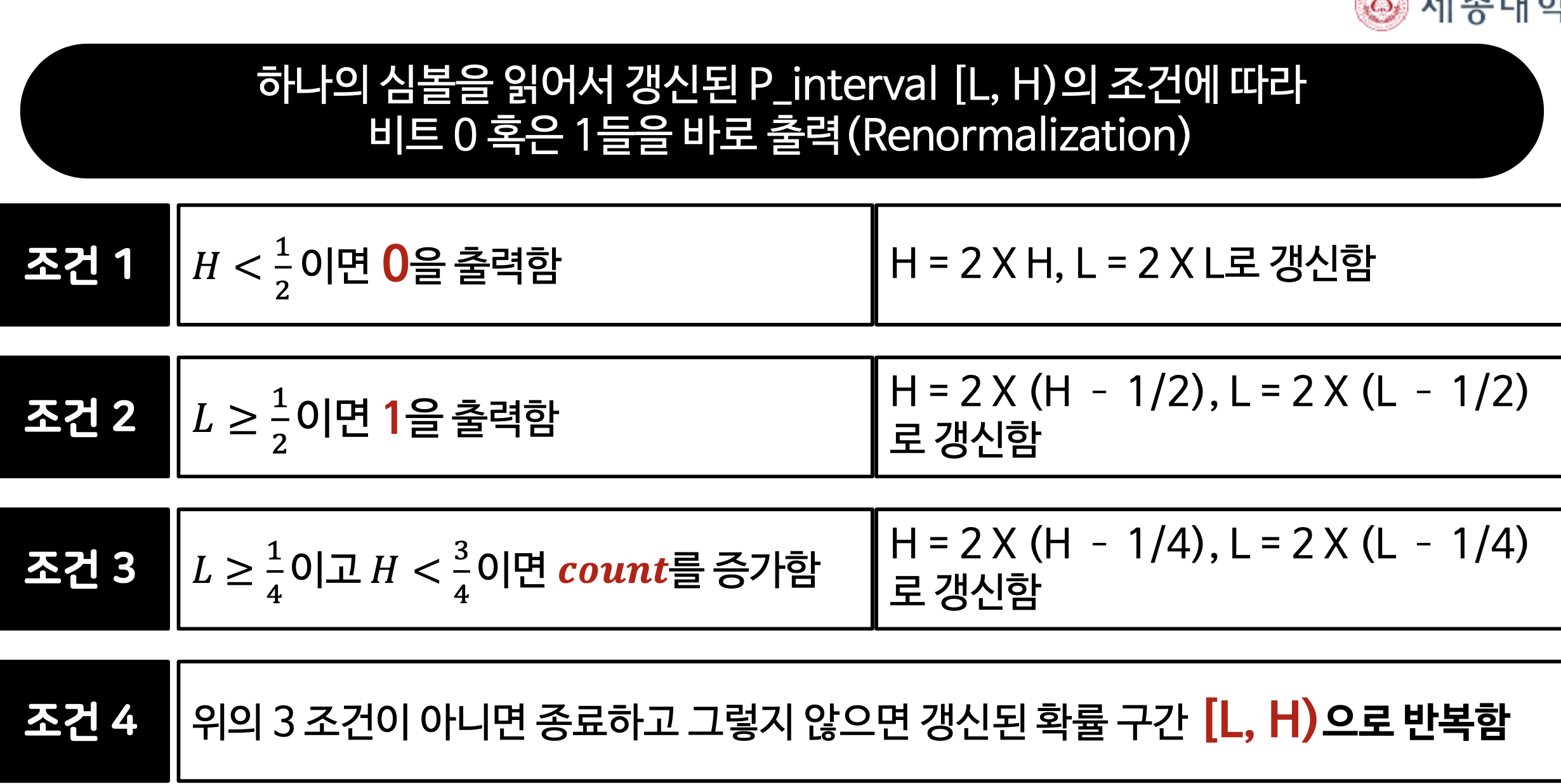 - Renormalization을 기반으로 한 산술부호화로 데이터를 압축할 수 있다.