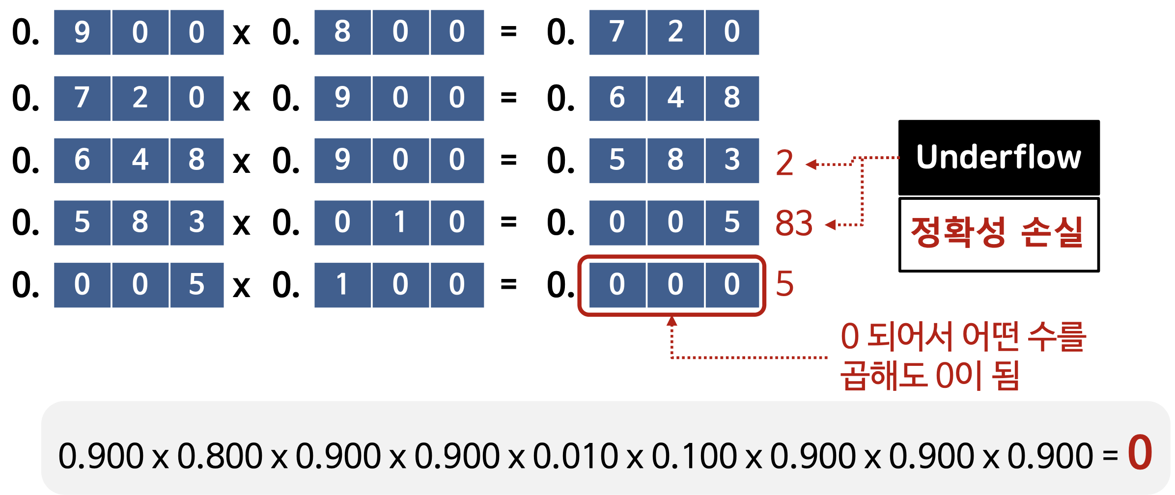 - 확률 곱하기의 Underflow 문제를 설명할 수 있다.