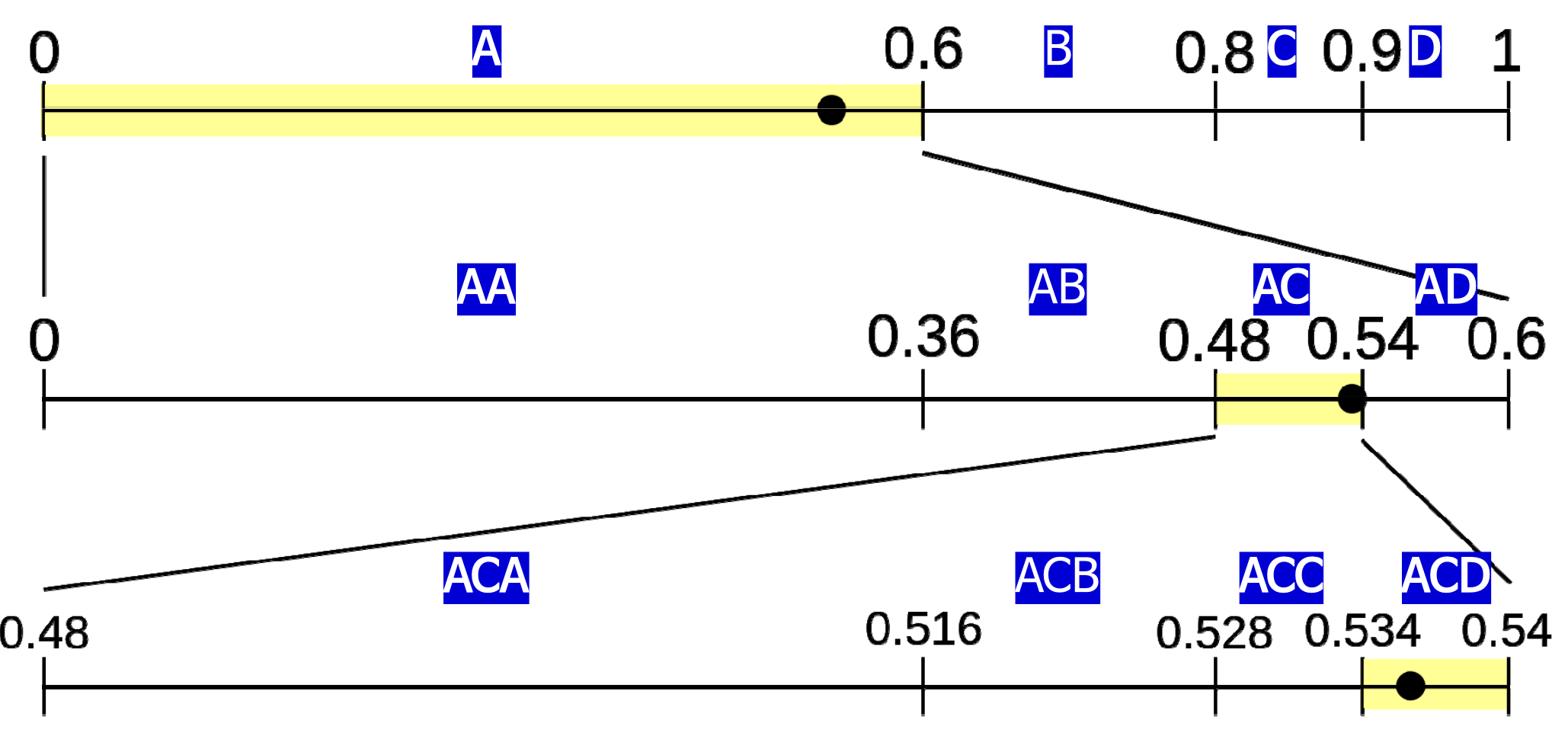 - 각 심볼마다의 최대-최소 확률을 가중한 결과의 값 범위를 통해 압축하는 기법