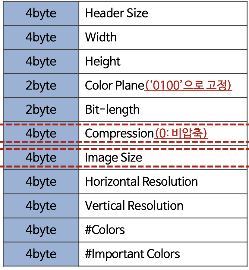 - Header Size ⇒ 비트맵 정보 헤더의 사이즈, 기본 40 바이트