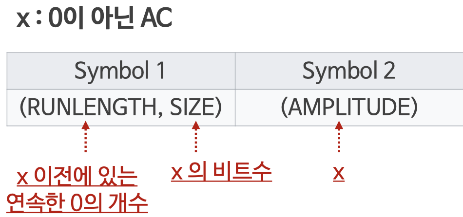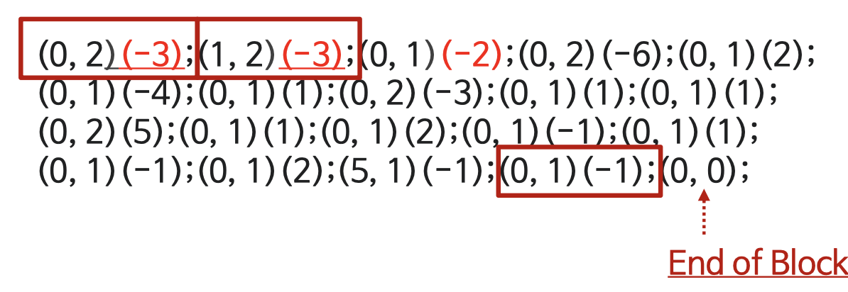 (연속한 0의 개수와 x의 비트 수),(x의 정보)를 이용해서 값을 허프만 코딩한다.