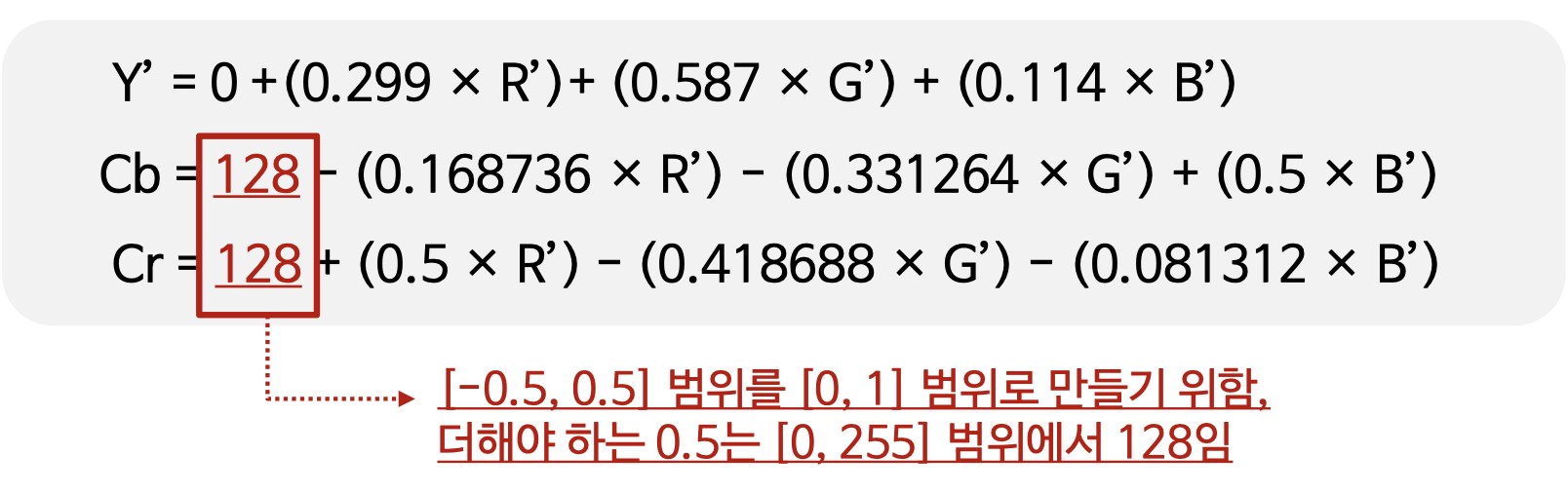 YCrCb 공식에 사용되는 Rd’, Gd’, Bd’은 픽셀 값으로 [0,255]의 값을 가짐