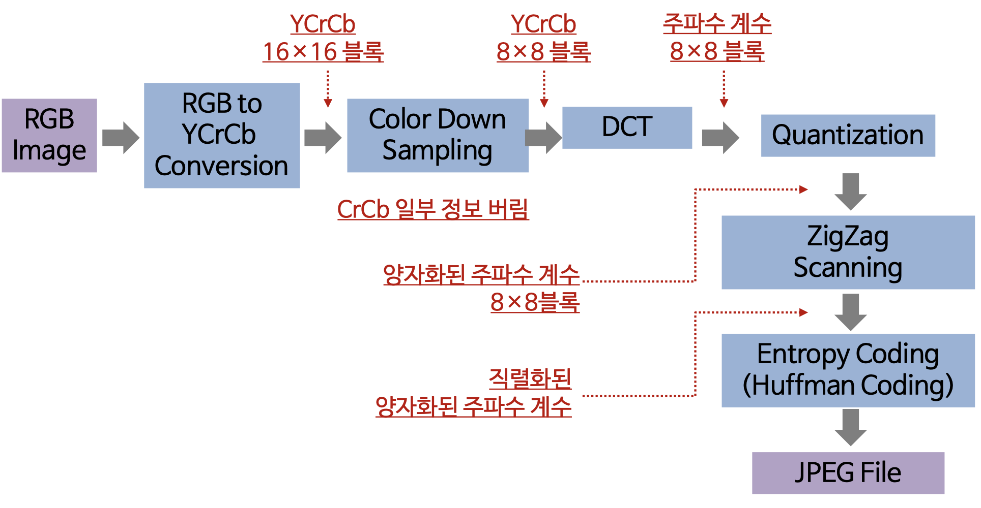 - 손실 압축을 사용, 원 영상 화질을 최대한 유지하면서 데이터의 크기를 줄인다.