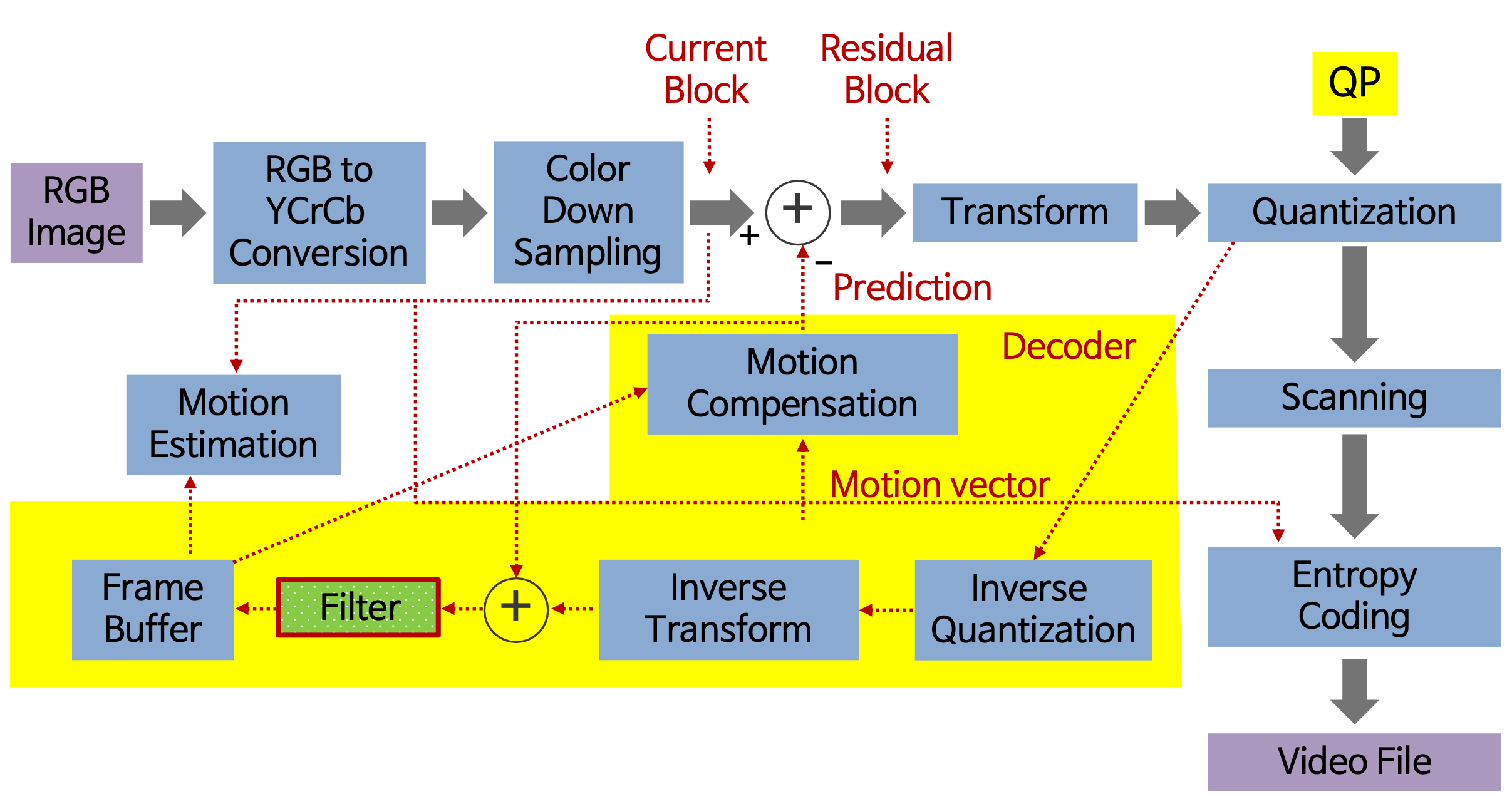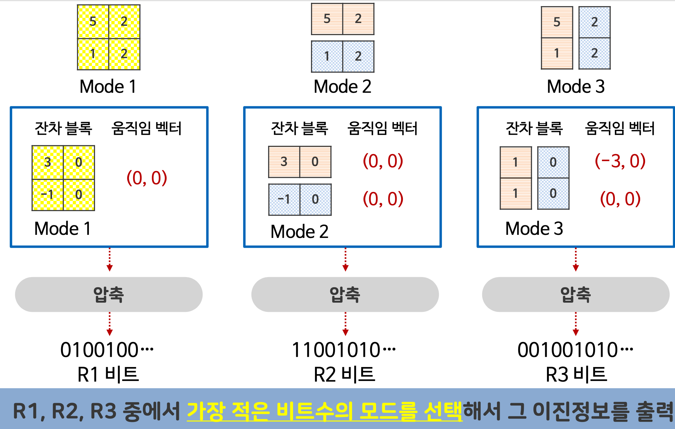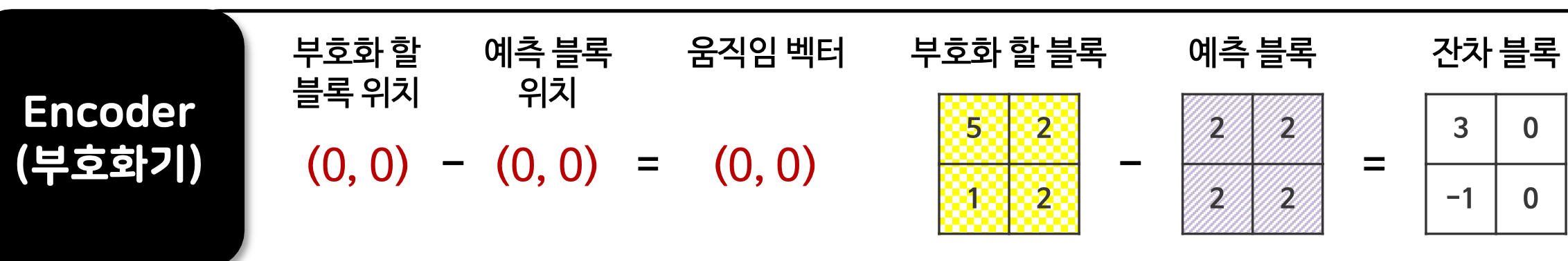 ⇒ 부호화기는 움직임 벡터, 잔차 블록 두 가지 값을 알고 있다.